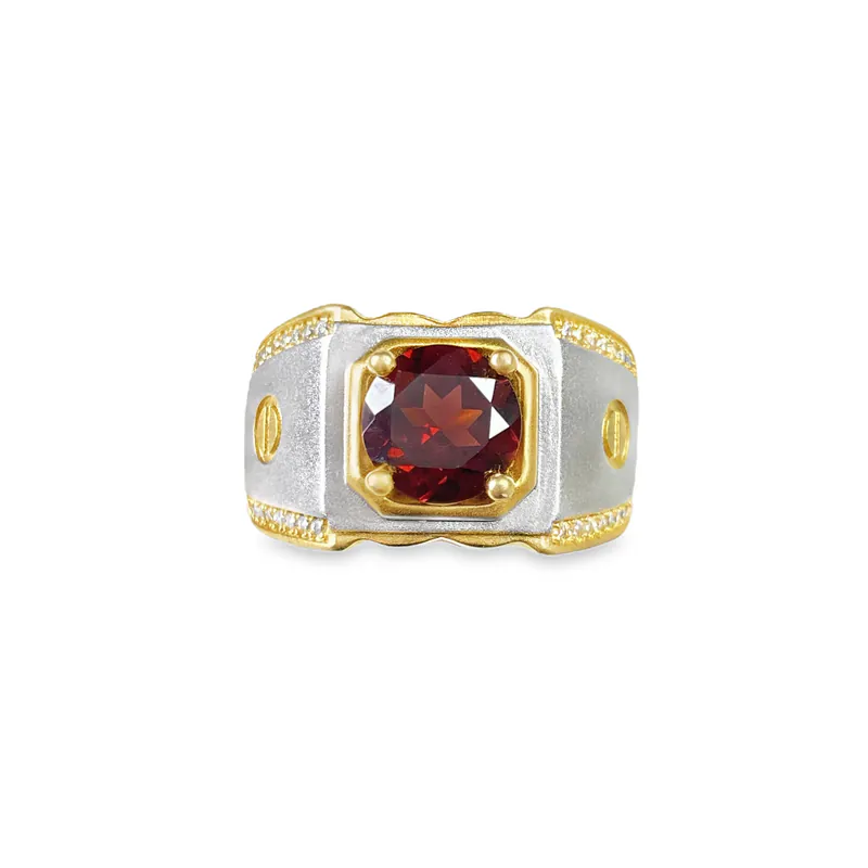 Make a bold statement with the Men’s Garnet Statement Ring, a striking piece of luxury jewelry designed for confidence and style. Featuring a rich, deep-red garnet set in a two-tone gold design, this ring combines classic elegance with modern masculinity.