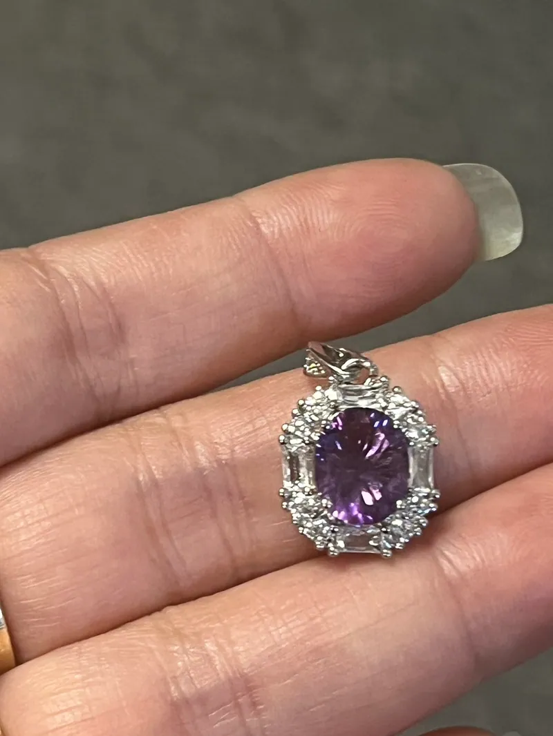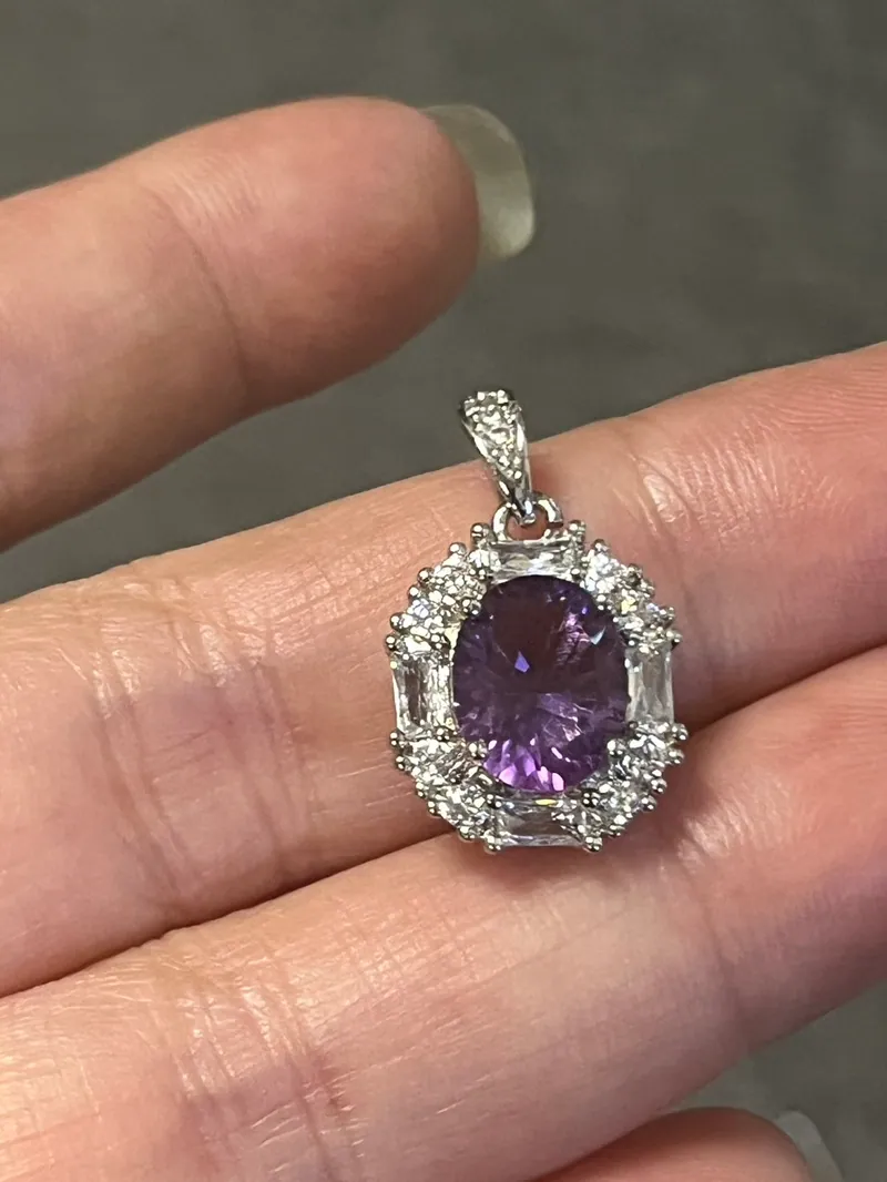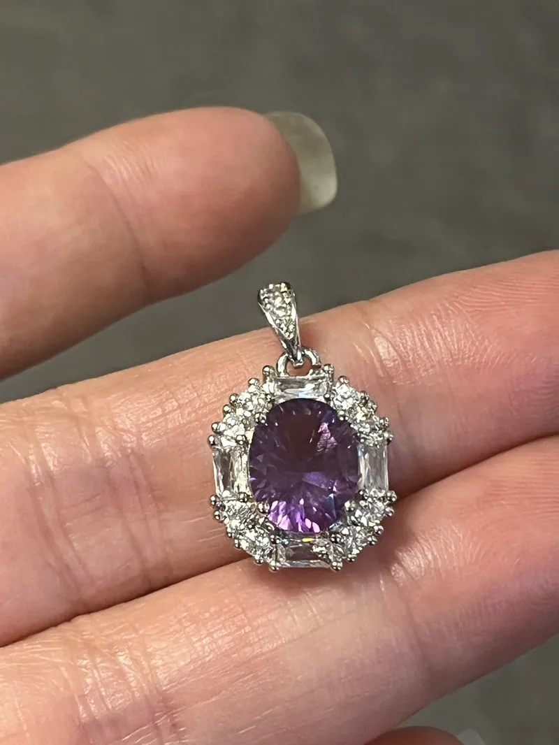 A regal amethyst pendant showcasing deep purple brilliance and elegant craftsmanship, designed in 925 sterling silver with lotus facet artistry, surrounded by sparkling zirconia for a timeless royal charm.